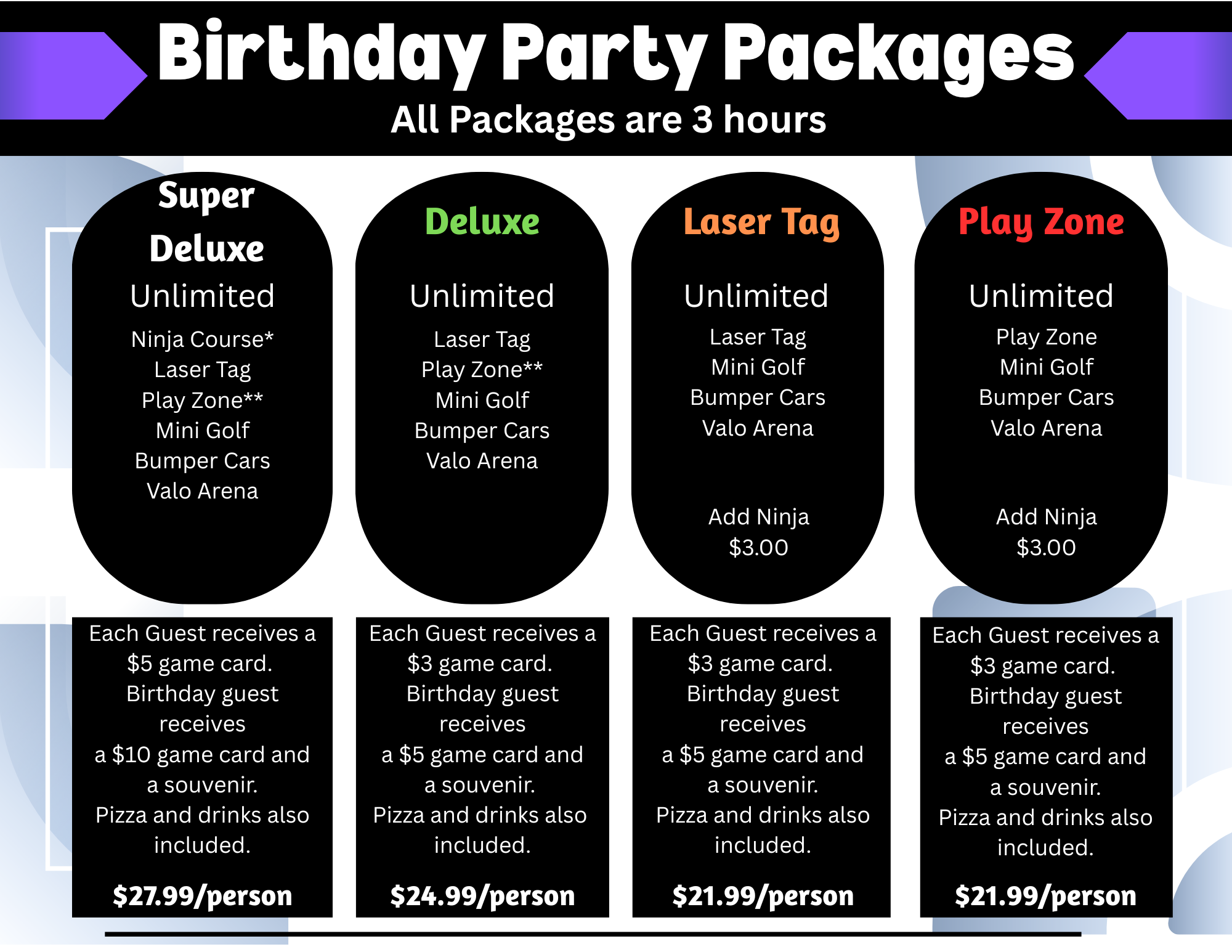 Because I always want the “what’s it going to cost?” details up front—Grand Slam offers a few different birthday party packages, and they’re designed so you can pick what fits your group. From what I’ve seen, the packages generally include a set party time (often around 3 hours) and a mix of food + activities. The options range from their top-tier Super Deluxe package (the most “everything included” option) to Deluxe, plus packages that center more specifically around Laser Tag or the Play Zone (for kids 12 and under). Most packages also bundle in things like arcade credits and pizza/drinks, and some include birthday-kid perks.